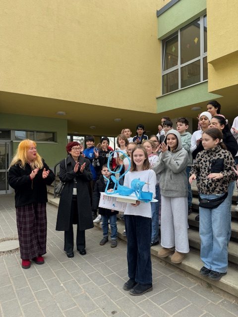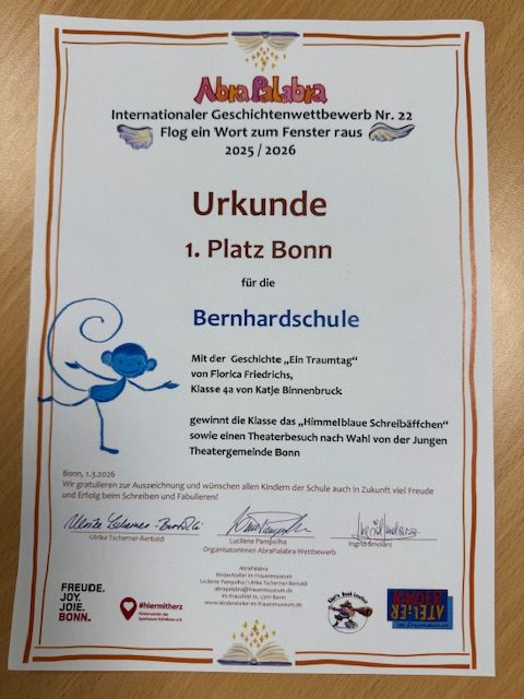 Juchhu! Florica aus der 4a hat die großartigste Geschichte geschrieben und den 1. Platz gewonnen. Die ganze Klasse geht als Gewinn nun zu einem Theaterbesuch ins Junge Theater und der blaue Affe wurde heute als Wanderpokal überreicht. Wir sind alle mächtig stolz!